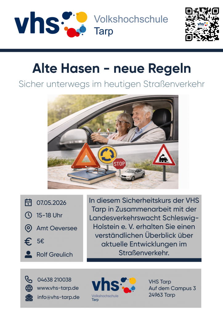 Daher bietet die Volkshochschule Tarp in Zusammenarbeit mit der Landesverkehrswacht Schleswig-Holstein e. V. für lebenserfahrene Menschen, die vor vielen Jahren ihre Fahrerlaubnis erworben haben, einen Sicherheitskurs an.