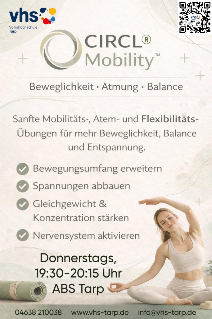 Flexibilitäts-, Atem- und Mobilitäts-Übungen sollen helfen, den Bewegungsumfang wieder herzustellen und körperliche Einschränkungen zu überwinden und gleichzeitig eine Verbesserung von Gleichgewicht und Konzentration zu erreichen. Darüber hinaus wollen wir die Beweglichkeit erweitern und Spannungen abbauen. Stimuliere das Nervensystem des Körpers, um Muskelaktivierung und Durchblutung zu fördern.