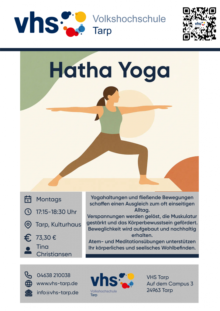 Yogahaltungen und Bewegungsabläufe bieten einen Ausgleich zu den oft einseitigen Alltagshaltungen. Verspannungen werden gelöst , die Muskulatur gestärkt, das Körperbewusstsein belebt, Beweglichkeit aufgebaut und erhalten. In Verbindung mit Atem- und Meditationsübungen fördern sie das körperliche und seelische Wohlbefinden, indem man innere Ruhe findet und neue Kraft schöpft. Der Kurs ist geeignet für Anfänger und Teilnehmende mit Vorkenntnissen. Bitte Yogamatte/ Unterlage , bequeme Kleidung , evtl. leichte Decke , Kissen und Getränk mitbringen.