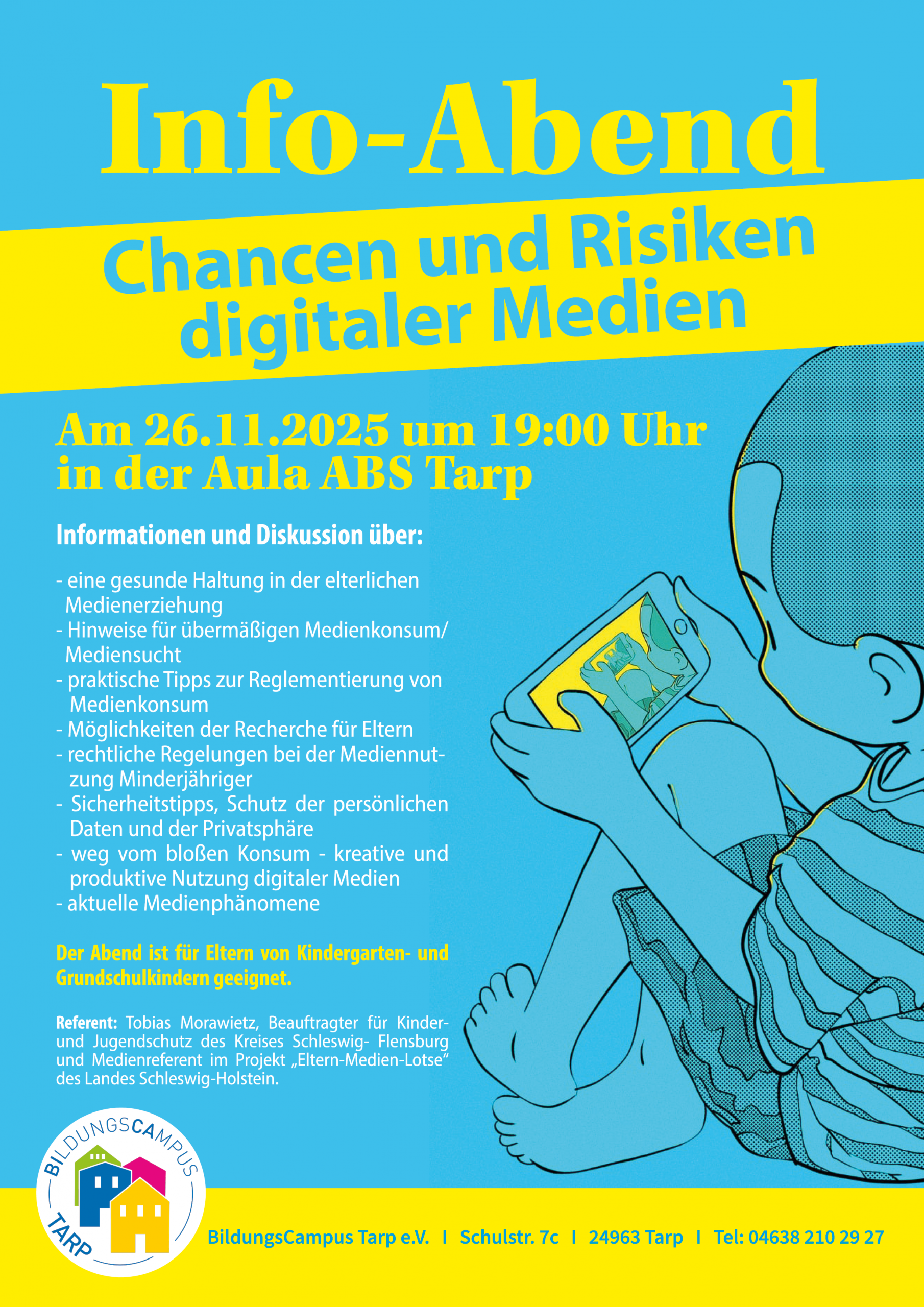 Mi26Nov19:00Mi22:00Infoabend "Chancen und Risiken digitaler Medien"Für Eltern von Kindergarten- und Grundschulkindern19:00 - 22:00 Alexander-Behm-Schule, Auf dem Campus 3, 24963 Tarp Veranstalter: Bildungscampus Tarp