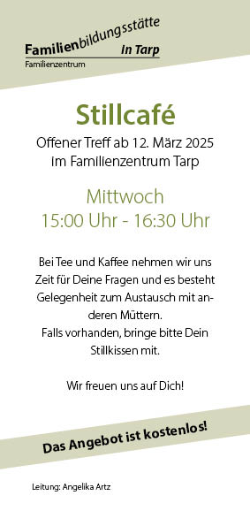 Mi12März15:00Mi16:30StillcaféOffener Treff im Familienzentrum Tarp15:00 - 16:30 Veranstalter: Familienzentrum Tarp
